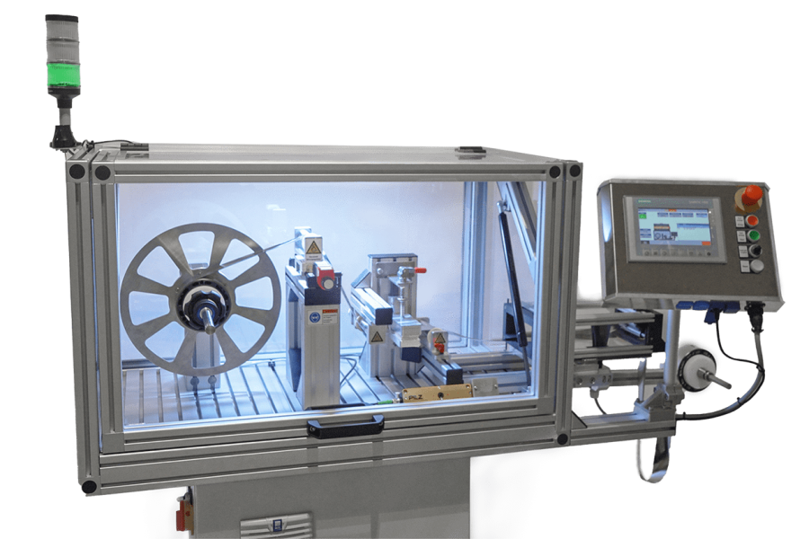 Die Maschine ist in einem geschlossenen Schutzgehäuse mit Sichtfeld untergebracht. Der Wickelvorgang wird über eine zentrale Steuerungseinheit mit Touch-Panel bedient und überwacht. Alle Prozessparameter wie Drehmoment, Geschwindigkeit und Bandspannung können über die Steuerung eingestellt und überwacht werden.